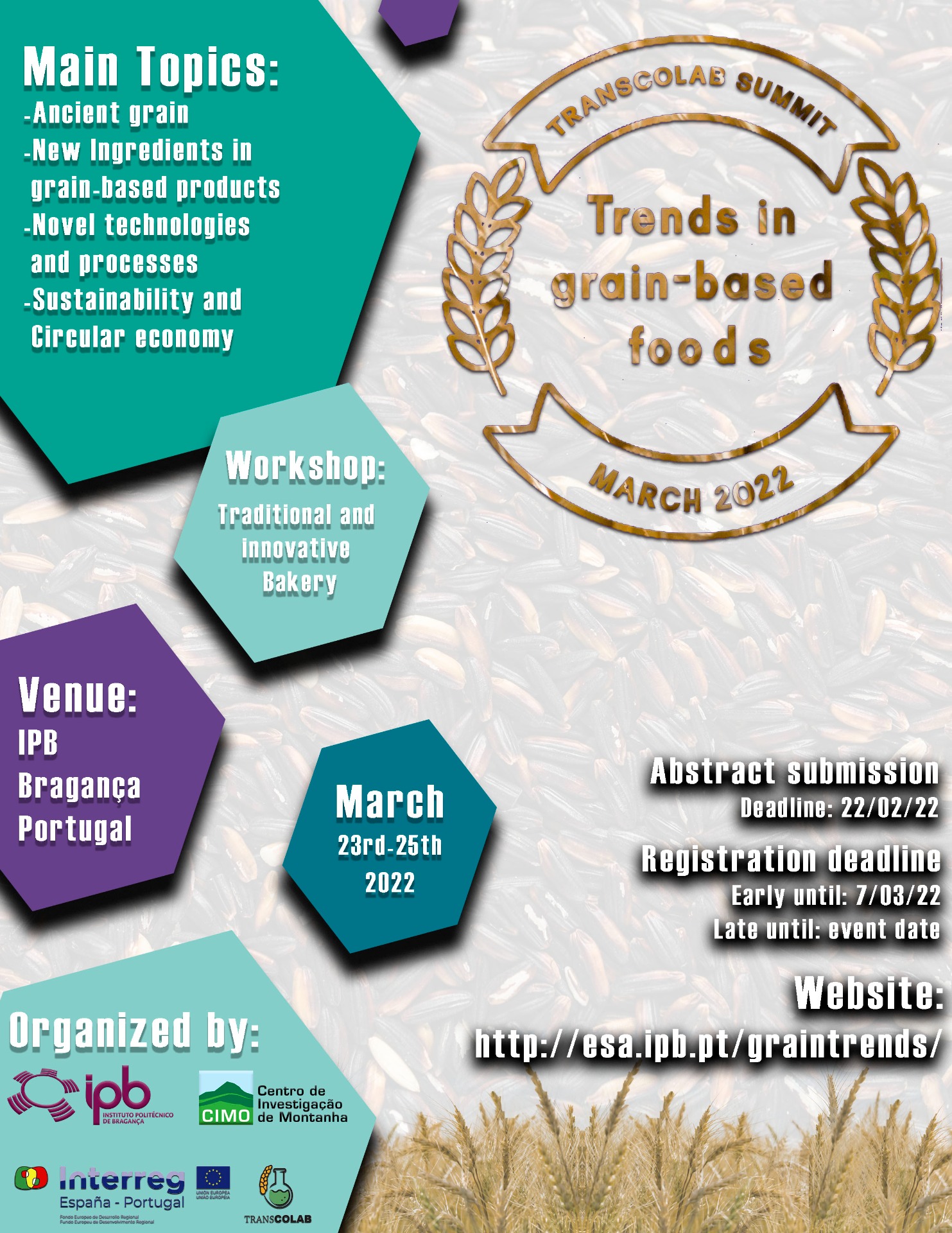 El Centro de Investigación de la Montaña del Instituto Politécnico de Braganza celebrará el TRANSCOLAB SUMMIT: Tendencias en alimentos a base de cereales, en formato presencial, del 23 al 25 de marzo de 2022, en Bragança, Portugal.